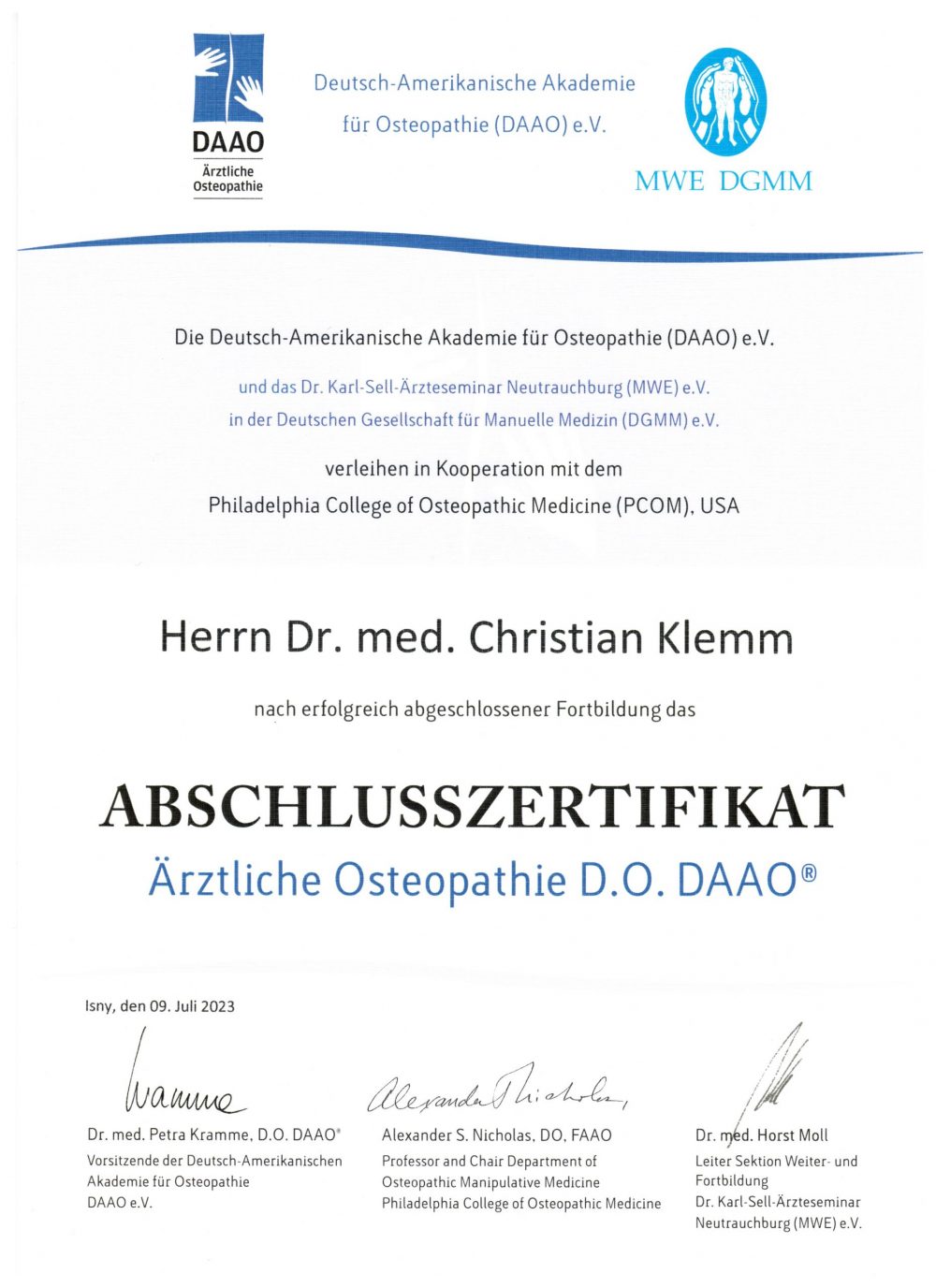 Abschlusszertifikat-Farbe-23-07. Return to Praxis Dr. Christian KlemmView image at full size, 1000 × 1376